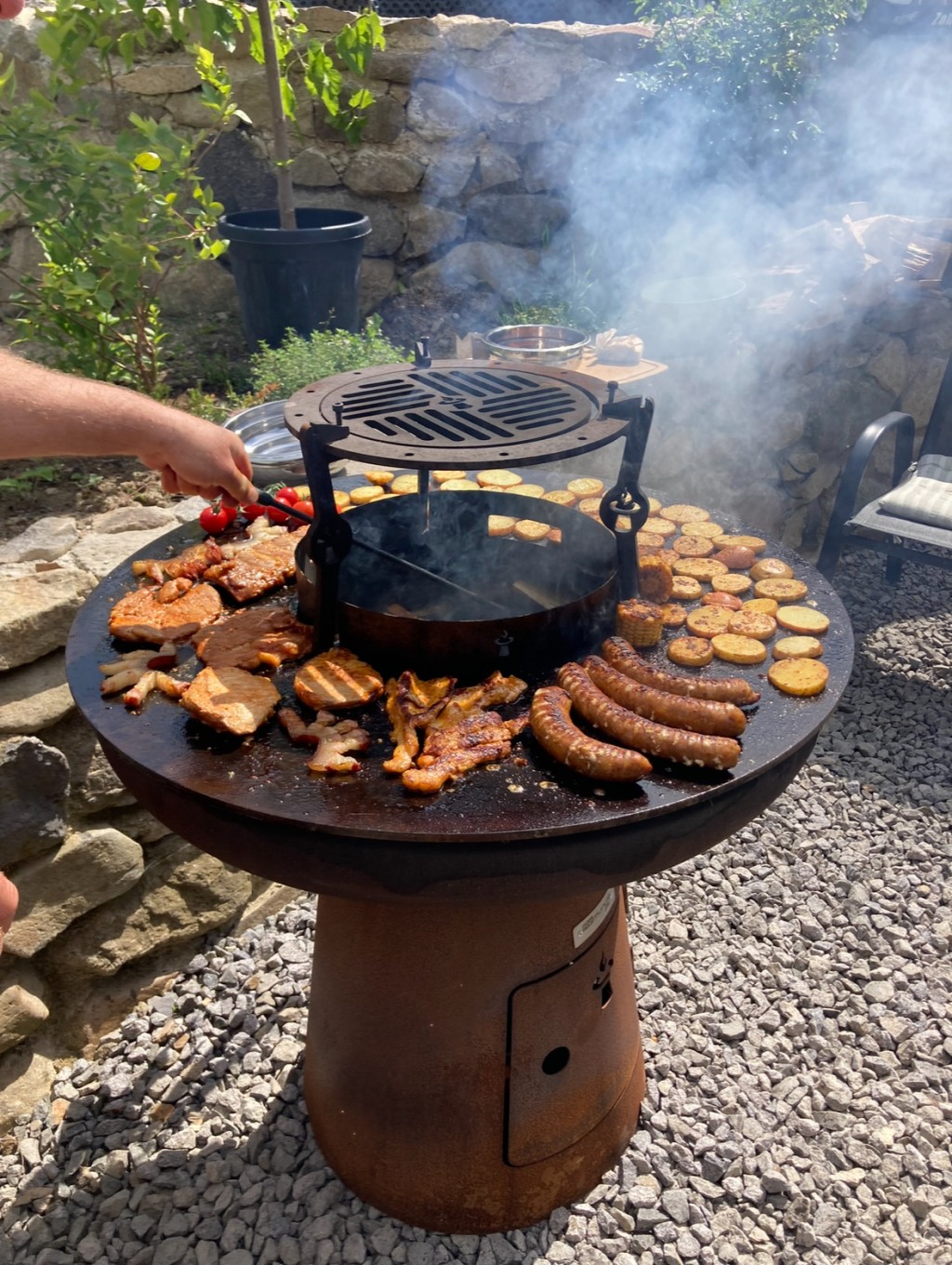 K domčeku patrí aj rozkvitnutá záhrada, ktorá prirodzene splýva s interiérom. Nájdete tu slnečnú terasu s letnou kuchyňou a bylinkové záhony, ktoré vám počas celého roka ponúkajú chutné a zdravé plody. Vonkajšie ohnisko s netradičným kruhovým grilom sa postará o gurmánsky zážitok pod holým nebom – ideálne na večerné posedenia pri ohni.